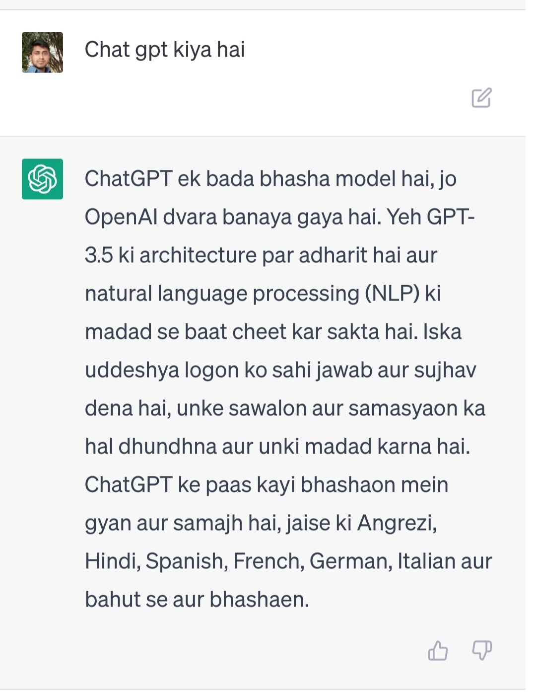 Reply ChatGPT ek bada bhasha model hai, jo OpenAI dvara banaya gaya hai. Yeh GPT-3.5 ki architecture par adharit hai aur natural language processing (NLP) ki madad se baat cheet kar sakta hai. Iska uddeshya logon ko sahi jawab aur sujhav dena hai, unke sawalon aur samasyaon ka hal dhundhna aur unki madad karna hai. ChatGPT ke paas kayi bhashaon mein gyan aur samajh hai, jaise ki Angrezi, Hindi, Spanish, French, German, Italian aur bahut se aur bhashaen.